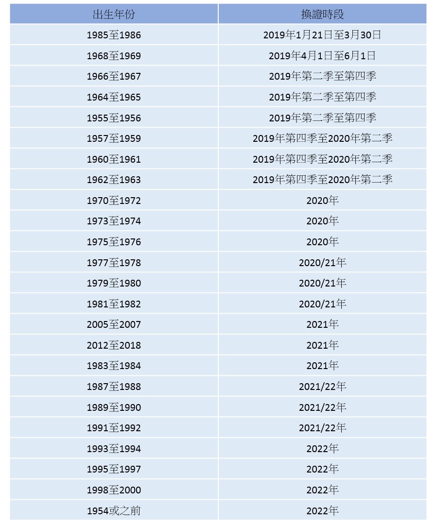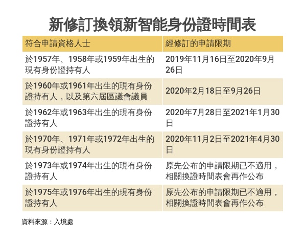 身份èæé 2020 æºè½èº«ä»½èæ°æé æé"表 æèå°å é ç´éç¥æ´å Holidaysmart åææ¥å¸¸ from image.presslogic.com 1 day ago · 入境事務處(入境處)今日(七月十五日)公布,全港市民換領身份證計劃(換證計劃)的第四周期換證將於二 二一年九月二十日開展。. Jul 15, 2021 · 入境處今日(15日)公布,1977年至84年及87至88年出生的香港居民換領新智能身份證可於以下時間段前往換領: 1977年、1978年或1979年出生者,可於2021年9月20日至11月18日申請;於1980年、1981年或1982年出生者,可於. 簽證/進入許可 身份證 居留權 旅行證件 中國國籍 出生及死亡登記 婚姻登記. 入境事務處處長歡迎辭 部門組織 理想、使命及信念 人員編制 服務承諾 入境事務處使用服務人士委員會 入境事務處優質服務的認同 招聘事宜 年度開放數據計劃. 入境處展開咗全港 #換領新智能身份證 計劃,大家記得把握好機會影返張靚仔靚女相,想知點樣 #化粧 先可以影到一張成功嘅 #黑白證件相 ? 快啲睇. Jun 10, 2021 · 全港共有9間智能身份證換領中心,市民可在星期一至六,上午8時至晚上10時(公眾假期除外),提前預約前往換證。 智能身份證換領中心 地址